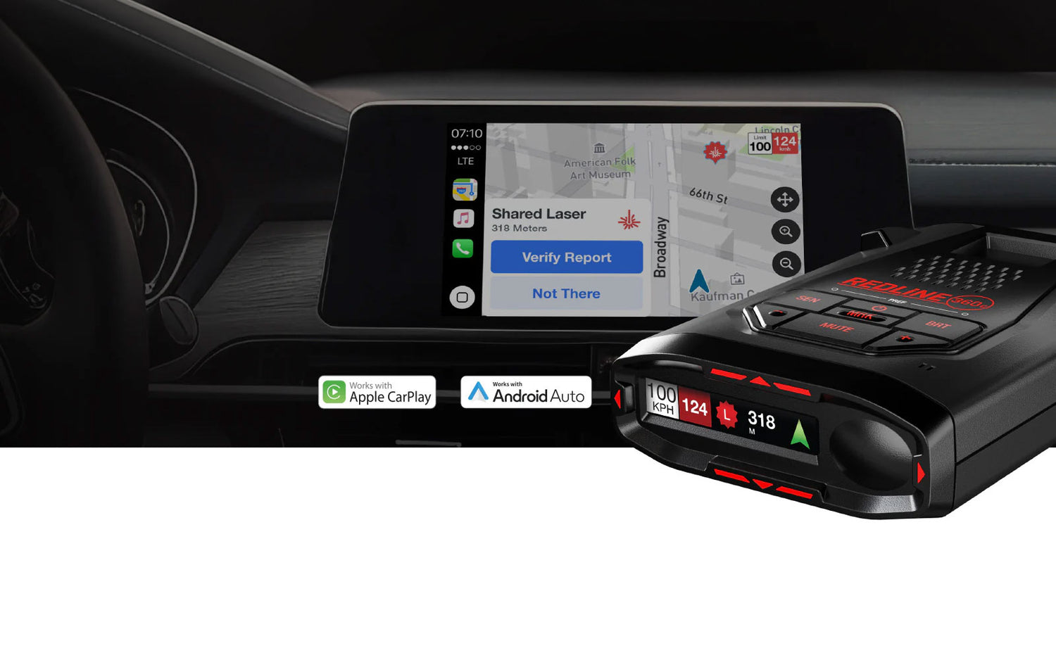 Drive Smarter works with Apple CarPlay® and Android Auto™ so you can view your route enhanced with shared radar and laser detector alerts, red light and speed camera locations, crowdsourced road conditions, and more.