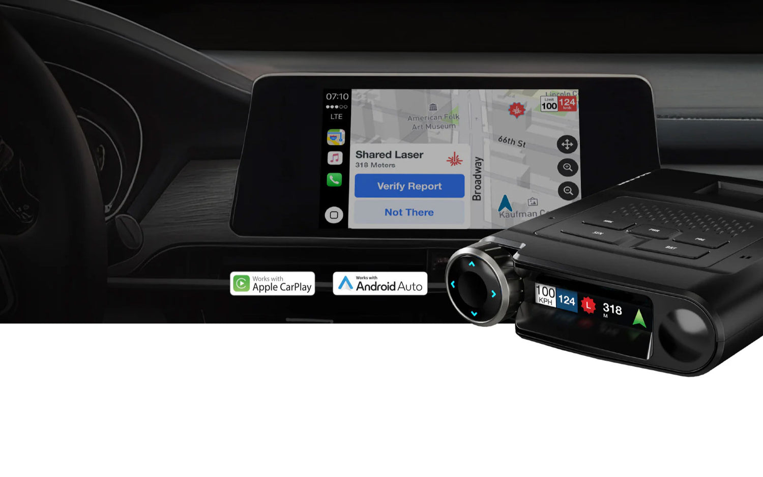 Drive Smarter works with Apple CarPlay® and Android Auto™ so you can view your route enhanced with shared radar and laser detector alerts, red light and speed camera locations, crowdsourced road conditions, and more.